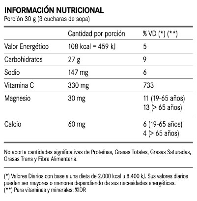 Máxima hidratación. Más rendimiento. Bebida isotónica de máxima y rápida absorción. Su fórmula aporta hidratos de carbono (maltodextrina y dextrosa), sales y minerales (cloruro de sodio, cloruro de magnesio, cloruro de calcio, cloruro de potasio) y vitamina C.